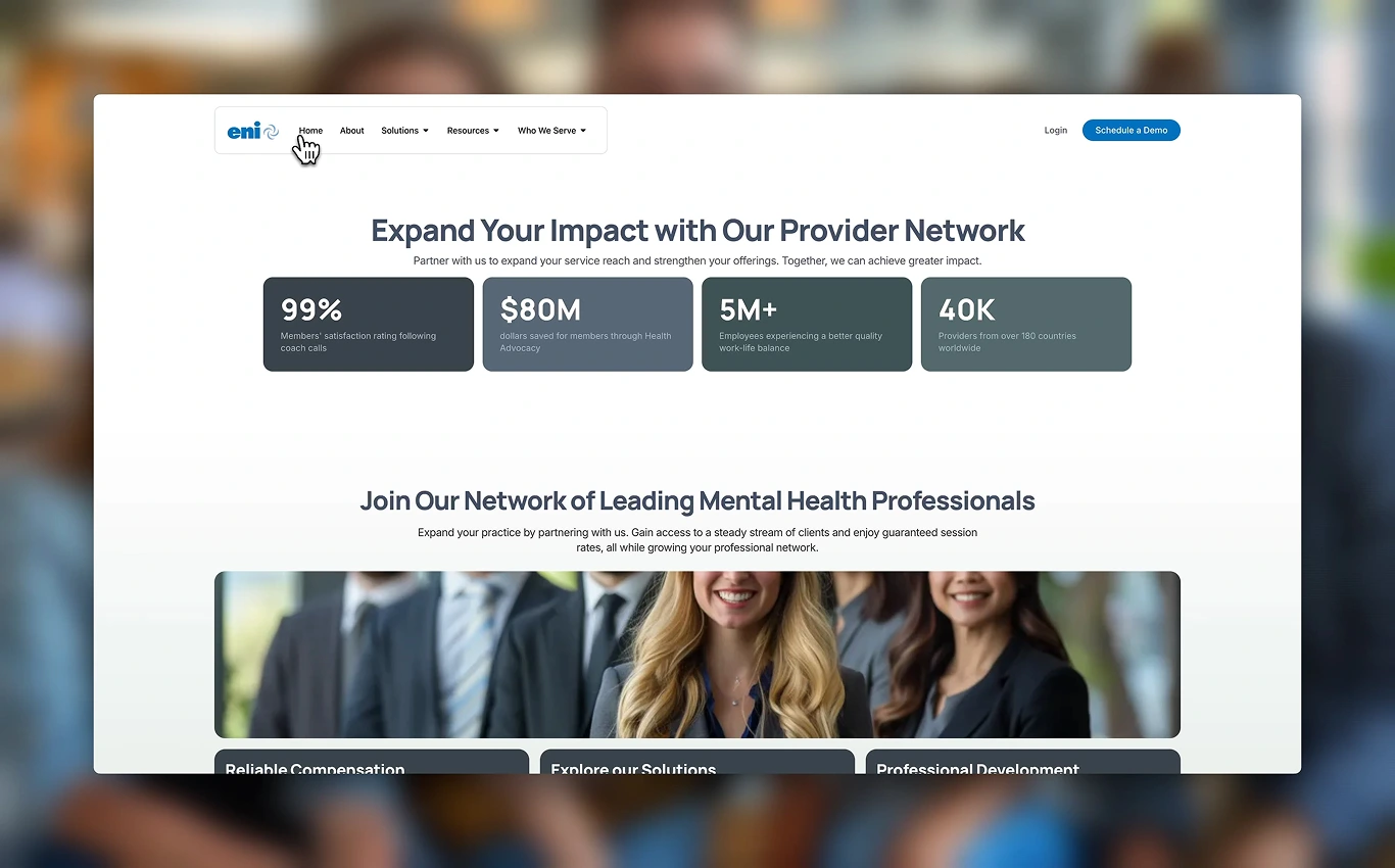 eni EAP Services needed a website that not only reflected their comprehensive range of services but also effectively guided their diverse audience to the right resources. Their existing site lacked structure, making it difficult for users to navigate the extensive content and find the support they needed. Additionally, the website’s content was outdated and not aligned with the brand’s forward-thinking approach to employee well-being.